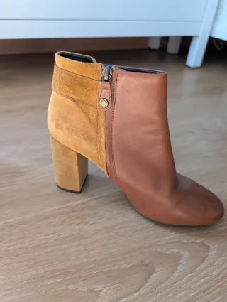 Botines de piel y ante con tacón marca Geox. Los he usado solo una vez, pero el tacón es demasiado alto para mi. Están en perfecto estado, como se ve en las fotos.
