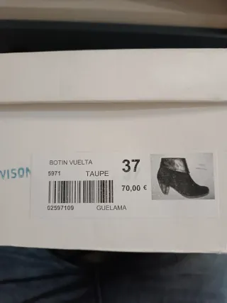 Botines de piel sintética en negro y tacón ancho, puntera redonda. La caña es estrecha y llevan cremallera. Tacón 6 cm. Les he puesto tapas nuevas pero no los he llegado a estrenar. No tengo su caja original.