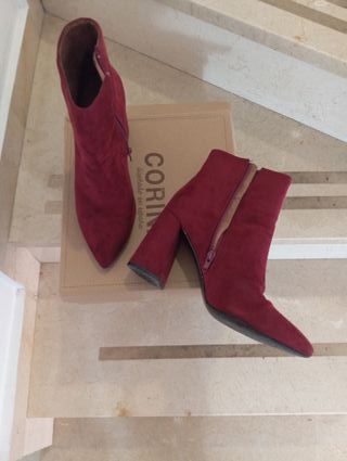 Elegantes botines de tacón con un vibrante acabado. - Material tipo ante. - Tacón grueso para mayor comodidad. - Punta afilada.