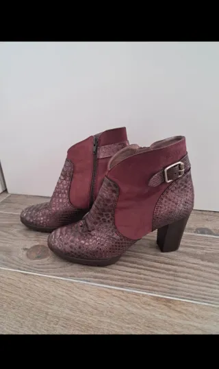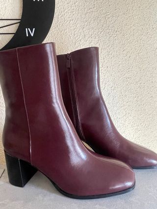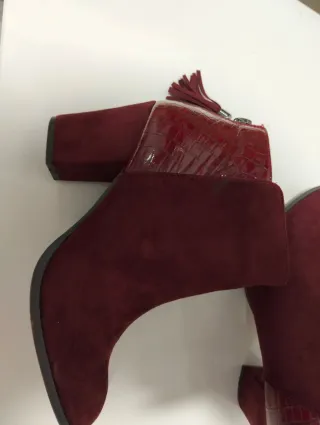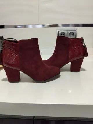 Botines de estilo moderno con un toque brillante. Talla 37. Poco uso - Color burdeos. - Tacón grueso con acabado de purpurina plateada. - Detalle de cremallera en la parte trasera.