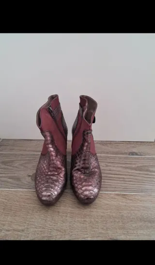 Botines de piel de la marca Hispanitas. Estos botines SON UN AUTÉNTICO LUJO!! los compré en una boutique de Madrid hace años pero sólo los pude poner 2 veces. Por prescripción médica no puedo usar tacones y estos eran la reliquia de la que me ha costado mucho deshacerme. Son SUPER BUENOS, estàn en perfecto estado y desde luego, si quieres lucir y lucirte estos botines son maravillosos!! me costaron cerca de 200 euros en su momento, el precio por el que los vendo... es un auténtico regalo. Son piel verdadera y buena! - Cierre con cremallera lateral. - Detalle de tira con hebilla. - Tacón de bloque.