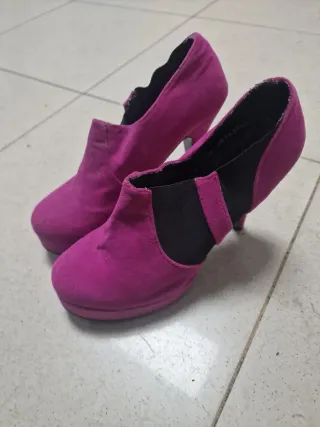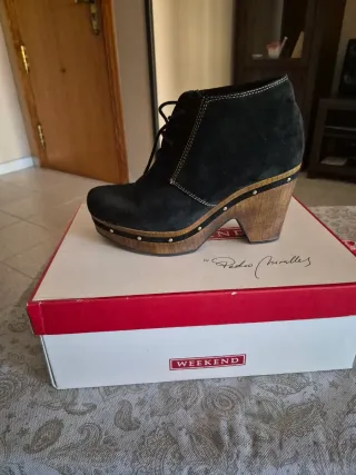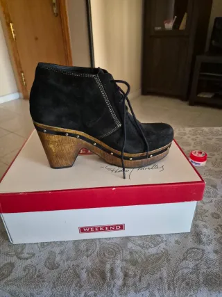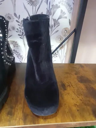 2° mano vendo botines marca Marypaz, de ante color negro, muy elegantes, Cremallera lateral, tacón de aguja de 9,5 cm y plataforma de 2,5cm. Gastos de envío no incluido en el precio.