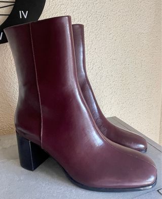 Botines de estilo moderno con un diseño elegante. - Color burdeos. - Tacón cuadrado y robusto.