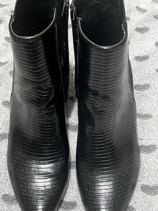 Botines de tacón con un diseño elegante y moderno. - Combinación de ante y charol. - Detalle de cremallera con borla. - Tacón grueso para mayor comodidad.