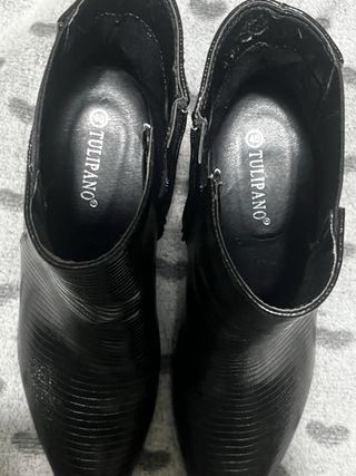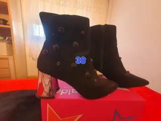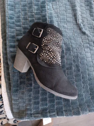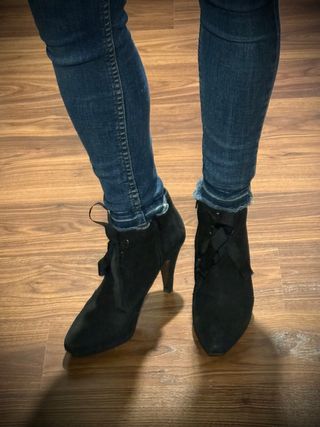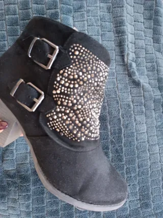 Botines de tacón en color negro. - Material exterior de ante. - Detalle de pedrería en la caña. - Cierre con cremallera lateral. están en perfectas condiciones. son muy cómodos y da talla 39