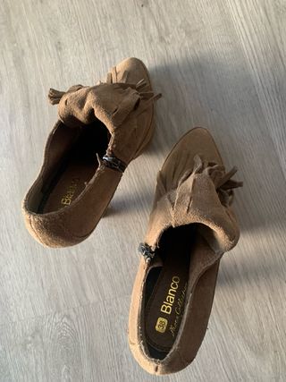 Botines de ante con un diseño moderno y cómodo. Tienen un cordon que tapa la lengüeta que habría que cambiarlo. - Material: Ante - Detalle de flecos - Cierre de cremallera lateral - Tacón de plataforma