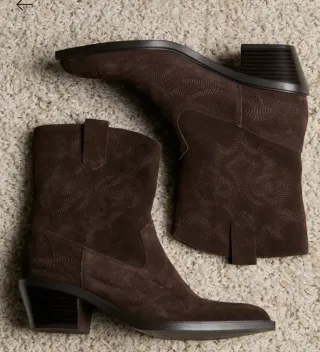 Botines estilo cowboy con tacón, fabricados en piel. De Stradivarius. Usados un par de veces. - Diseño con detalles bordados. - Tacón de bloque para mayor comodidad. - Punta afilada.