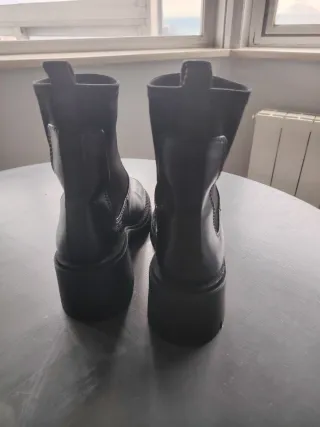 Botines de plataforma con hebillas, usados una sola vez. - Diseño moderno y llamativo. - Plataforma gruesa y tacón cuadrado. - Cierre con hebillas metálicas.