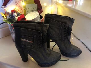 Botines de tacón con un diseño vaquero único. - Material denim. - Detalle de cordones. - Tacón alto y plataforma.