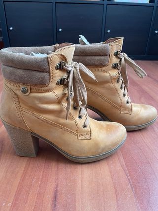Botas de tacón de la marca Panama Jack. - Color beige y marrón. - Diseño de caña alta. - Cierre con cordones. - Detalle de cuello acolchado.