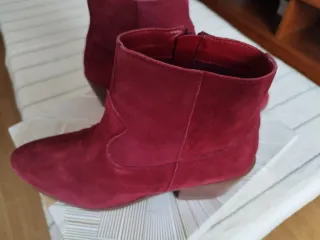 Botines rojos de tacón ancho, en material tipo ante. Talla 38. Cierre lateral con cremallera. Muy cómodos y en perfecto estado.
