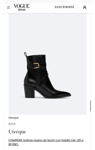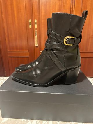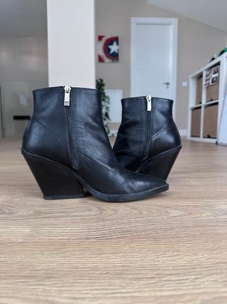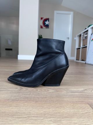Botines estilo cowboy de Zara. - Diseño en punta. - Tacón ancho y alto de 8 cm - Material de piel.