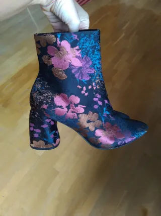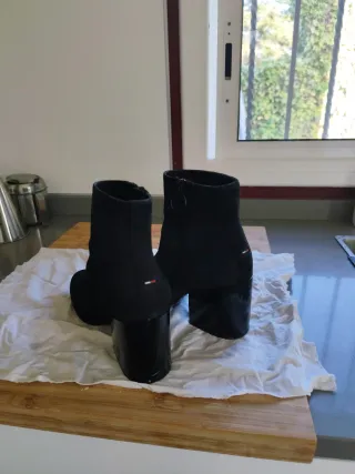 Botines de tacón ancho de terciopelo, T-40, de Stradivarius, nuevos con etiqueta. Sólo puestos para andar en la tienda (ya estaban las suelas algo sucias, entiendo que porque se los probó más gente a lo largo del tiempo). Su precio original es 29'95€, comprados en rebajas por 15'99€, a la venta por 6'90€. (Me voy de Madrid hoy día 22 y vuelvo el 7). En perfecto estado salvo por la plantilla interior que tiene la parte del talón algo despegada (no tengo pegamento, sorry, pero tiene muy fácil solución con tan solo un poquito de pegamento). Hago lotes y negocio precios. Ventas en persona y envíos. Gracias!