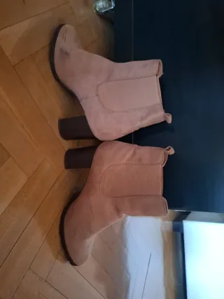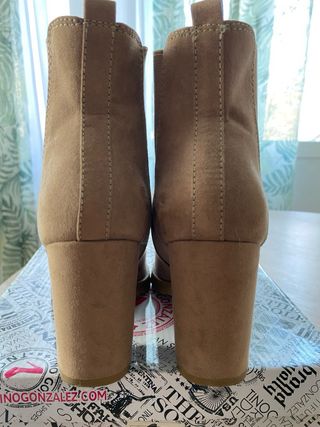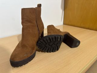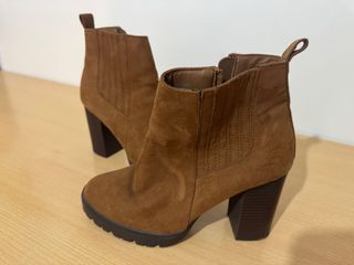 Botines de ante en color marrón con tacón. Cuentan con elástico en los laterales para facilitar su puesta.Puestos una vez.Made in China.Puse marca Zyga porque me obligaban a poner una marca. Hago envíos o entrego en mano en Salamanca.El tacón mide casi 9 cm de alto y 6 de ancho. - Material exterior: ante. - Tacón de bloque. - Diseño tipo chelsea.