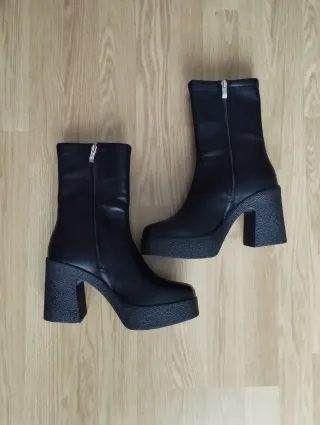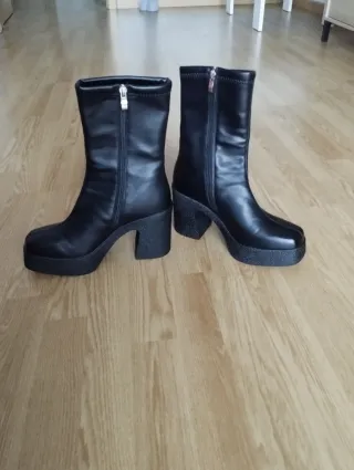 Botines negros con tacón ancho y plataforma. - Cierre de cremallera lateral. - Tacón grueso y cuadrado. - Punta redonda. -plataforma 2 cm -tacón 8 cm -talla 37
