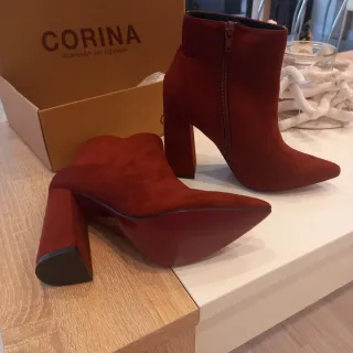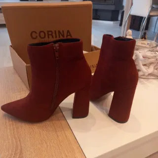 Botines de la marca CORINA en color granate. Un diseño elegante con tacón ancho y punta fina. - Material exterior tipo ante. - Cierre con cremallera lateral. - Tacón grueso y estable.