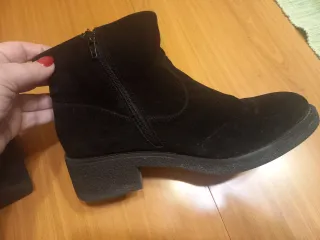 Botines de ante con tacón ancho. - Material: piel de Ante por fuera y piel auténtica y suave por dentro - Color: Negro - Tacón: Ancho - Suela de goma - La marca no se ve y no la recuerdo