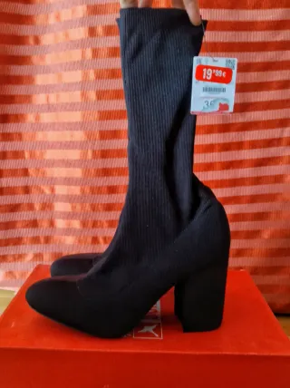 Botines tipo calcetín acanalado, negros, tacón ancho, talla 40, de Bershka, nuevos con etiqueta. Únicamente puestos para probar en la tienda, por lo que están en perfecto estado. Su precio original era 35'99€, se compraron por 19'99€, a la venta por 9'90€. Hago lotes con cualquiera de los artículos de mi armario y negocio precios. Hago ventas en persona y envíos. Gracias!