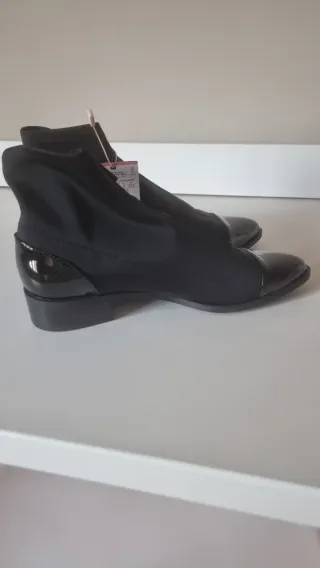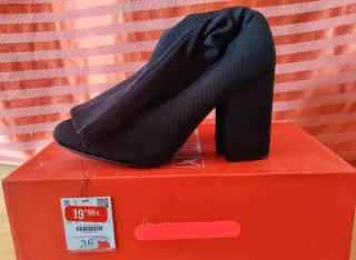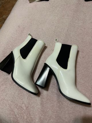 Botines de tacón ancho, T-40, de Stradivarius, nuevos con etiqueta. Sólo puestos para andar en la tienda (ya estaban las suelas algo sucias, entiendo que porque se los probó más gente a lo largo del tiempo). Su precio original es 29'95€, comprados en rebajas por 15'99€, a la venta por 9'90€. Están en perfecto estado salvo por la plantilla interior que tiene la parte del talón algo despegada (no tengo pegamento, sorry, pero tiene muy fácil solución con tan solo un poquito de pegamento). Hago lotes con cualquiera de los artículos de mi armario y negocio precios. Hago ventas en persona y envíos. Gracias!