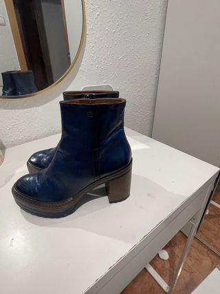 Botines PONS QUINTANA de piel azul marino – talla 37 (semi nuevos) Vendo botines originales Pons Quintana, de piel natural color azul marino, con logo metálico PQ lateral. Modelo de botín con tacón ancho y plataforma, muy cómodo y estable. Cierre con cremallera trasera. Están usados solo una vez, en estado excelente, sin desgastes apreciables (ver fotos). ✔️ Marca: Pons Quintana ✔️ Talla: 37 ✔️ Color: azul marino ✔️ Material: piel ✔️ Tacón: ancho, cómodo ✔️ Estado: semi nuevos (1 sola puesta) 💶 Precio original en tienda de este modelo: aprox. 190–220 € vendo por 40€