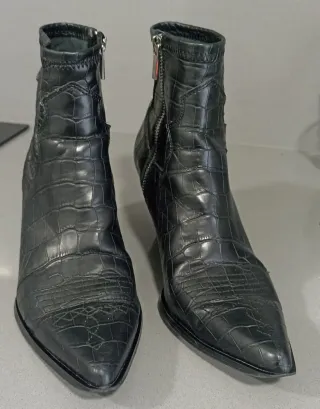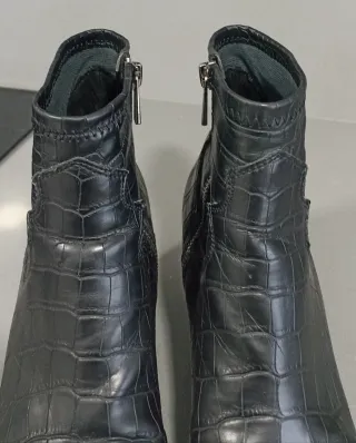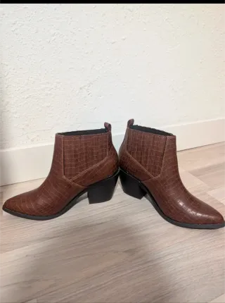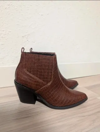 Botines de color marrón con acabado efecto cocodrilo, muy elegantes y fáciles de combinar. Tacón ancho y cómodo, ideales tanto para el día a día como para looks más arreglados. Punta ligeramente afilada que estiliza el pie. - Estado: como nuevos, solo tienen una puesta. - Cierre: cremallera lateral - Tacón: medio, ancho. - Estilo: casual / elegante / otoño-invierno Se venden por no darles uso.