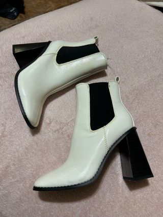 Botines de estilo Chelsea con un diseño moderno y elegante. - Material exterior blanco brillante. - Tacón ancho y alto para mayor comodidad. - Detalle de elástico lateral. - Punta afilada.