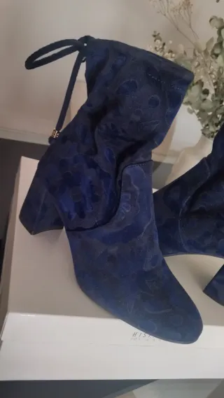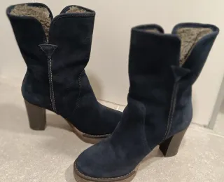 Botines de ante azul marino, forrados de borreguito color topo por dentro. - Tacón ancho, de unos 8, 5 cm. - Diseño tipo cowboy. - Caña media.