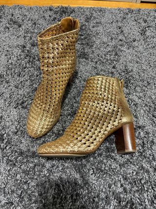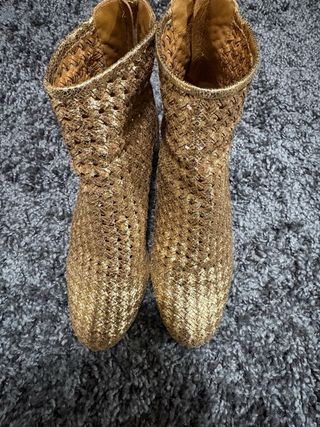 Botines de estilo Alba de la marca Sezane. - Diseño tejido en color dorado. - Tacón de bloque de madera. - Cierre de cremallera en la parte trasera. tacón ancho muy cómodo talla 39 puestos un día la caja no la tengo piel #sezane #botines #botinespiel #boots