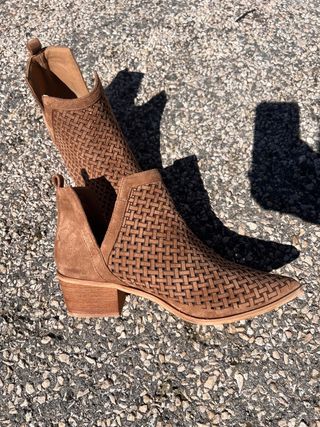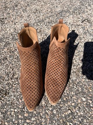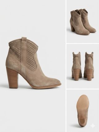 Botines estilo cowboy en color beige claro, muy tendencia 🤍 Efecto ante con detalles perforados muy bonitos. ✨ Estado: como nuevos, muy poco uso ✨ Tacón ancho muy cómodo (perfectos para caminar) ✨ Muy fáciles de combinar (jeans, vestidos, looks verano/otoño) 📏 Talla: 40 📍 Entrega en mano o envío 💬 Precio negociable dentro de lo razonable