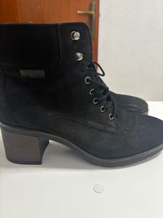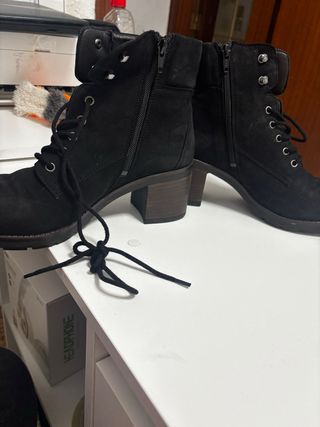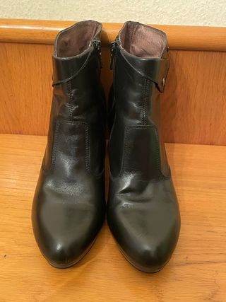 Botin de cuero negro y plataforma con tacon ancho. Cordones delanteros y hebilla cruzada pero se cierra con cremallera en el lateral . Estan usados pero muy cuidados y con tapas y suelas cambiadas para el invierno. Ya no puedo usarlos, me he roto un pie y me desaconsejan. Me encantaban . Muy cómodos y realmente buenos, porque son cuero .