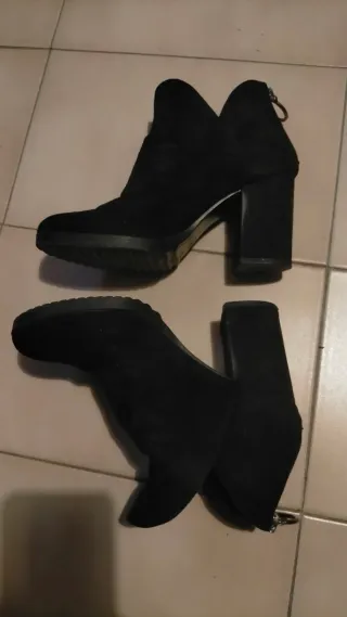 Botines de serraje en color negro. - Diseño con tacón ancho. - Corte en V en la parte delantera. Usado en muy pocas ocasiones! Son anchos, muy cómodos.