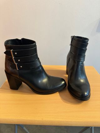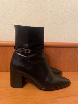 Botines de tacón. - núm.39 (medidas en la foto de las suelas). - material: piel color negro. - Cierre de cremallera lateral. - Detalle de hebilla. - Tacón ancho de altura media. Usados en muy buen estado (leves marcas de uso poco visibles).