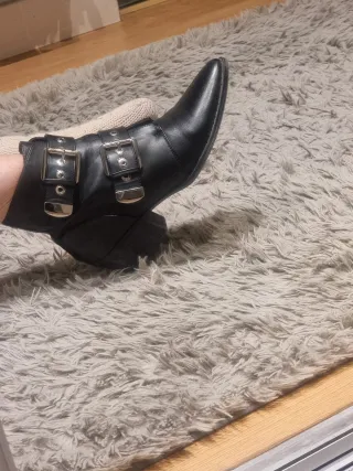 Botines de estilo motero con un diseño moderno y atrevido. Muy poco uso, perfecto estado. Súper cómodos, Tacón ancho de 5cm. Precio de compra en el Corte Inglés 65e. Talla 38. - Cierre con hebillas metálicas. - Detalle de tachuelas. - Punta afilada.