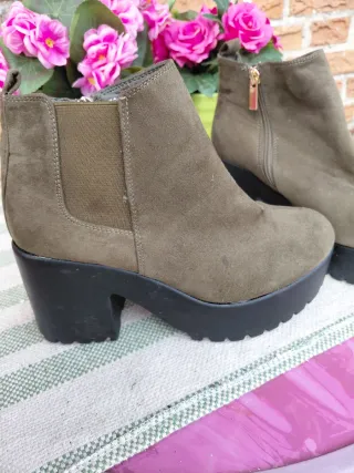 Botines de serraje en color verde oliva, muy cómodos. - Cierre con cremallera lateral. - Suela plataforma gruesa. - Tacón ancho.