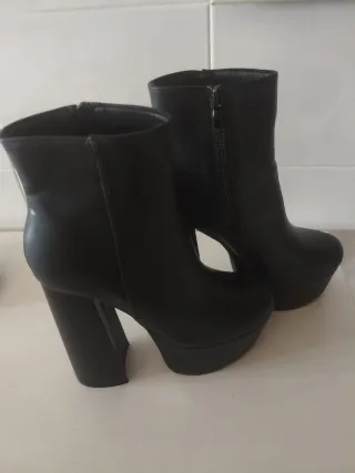 Botines elegantes con tacón ancho y plataforma. - Material exterior: piel sintética. - Cierre lateral con cremallera. - Detalle de elástico en los laterales. - Suela de goma antideslizante.