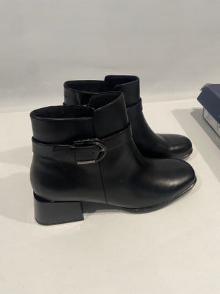🆕 Estado: Nuevo / a estrenar. 🆕 Botín elegante de piel auténtica (caña baja) con detalle de hebilla metálica en el talón. Tacón ancho estable y suela con grabado antideslizante para un uso cómodo todo el día. Ideal para oficina y looks casual chic. Características: - Color: azul marino. - Material exterior: 100% piel; plantilla acolchada. - Cierre: cremallera lateral. - Tacón: bloque aprox. 5–6 cm con detalle metálico. - Suela: goma antideslizante. - Talla 39. 📦 Entrega en Aluche o envío disponible.