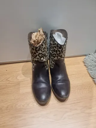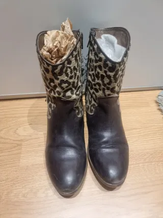 Botines de estilo cowboy con un llamativo estampado animal print. Súper cómodas y originales. De cuero. Están usadas, pero sin taras, solo haría falta ponerles suelas y tapas y como nuevas. De ahí el precio tan bajo que he puesto. Tacón ancho cómodo de 5cm. Son un 38. - Detalle de estampado animal en la caña. - Cierre lateral con cremallera. - Tacón para un look elegante