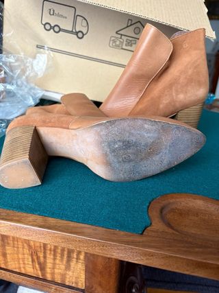 Son unos botines de terciopelo color teja con efecto aterciopelado, punta fina, tacón ancho y alto, y cierre de cremallera.👢💘👌🏻 Altura tacón 9 cm Tienen 2 puestas,el forro interior de polipiel del pie derecho se ha deteriorado como se aprecia en una de las fotos,por fuera están impecables,prácticamente nuevos. 👉🏻Se hacen envíos en el mismo día o al día siguiente por Correos e Inpost,no hago entregas en persona📦