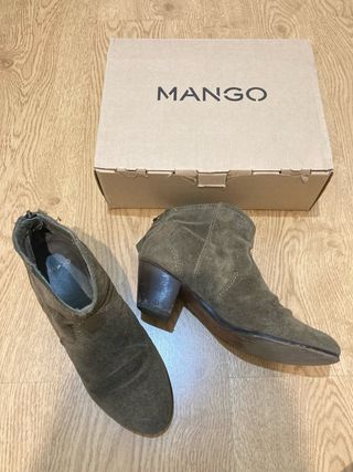 Botines estilo cowboy de serraje en color verdoso de Mango. Tacón ancho imitación madera de 4,5 cm de alto y altura total del botín de 15 cm. Punta redondeada y cremallera trasera. Usadas, uno de los tacones ha perdido un poco el color de apoyarlo al conducir.