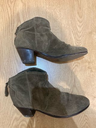 Botines de ante en color caqui. - Material: Ante - Cierre con cremallera trasera. - Diseño de botín tobillero. -Tacòn ancho de 6cm. -Muy cómodos. - En buen uso.