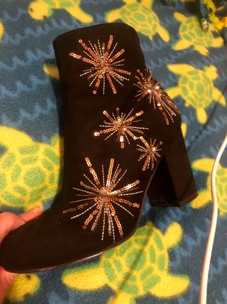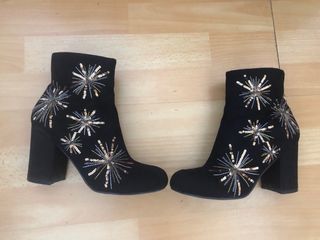 Preciosos botines o botas 👢 festivas, ideales para Fiestas ✨ o eventos, ideal Navidades 🎄 Piel de melocotón o antelina de color negra, con estrellas hechas de missanga y lentejuelas doradas. Cremalleras interiores. Están en muy buen estado. Tacón ancho de 8 cmts de altura. De New Look Talla o núm 37 Preferible INPOST