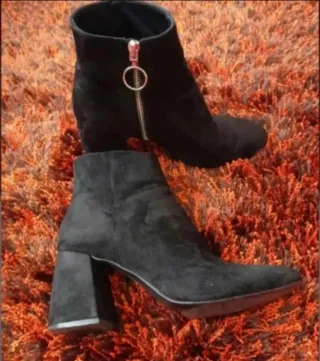 Botines de ante con tacón ancho. - Tacón grueso y cómodo. - Cierre de cremallera lateral. - Diseño elegante y versátil.