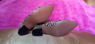 Botín de tacón ancho, talla 37, 8cm, con un poco de plataforma en la suela delantera. Usados una sola vez. Mitad del botín trasero imitación piel de serpiente, lisos por la parte delantera. Color negro.