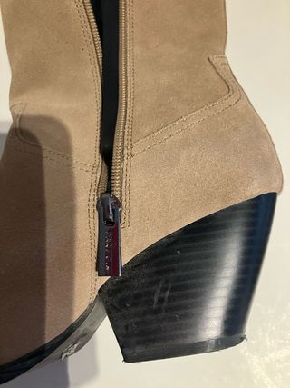 Elegante botín con tacón y plataforma. - Diseño con cremallera lateral. - Acabado en ante. - Usados solo 2 veces. - Tacón ancho. - Altura del tacón 12'5cm. - Altura de la plataforma 4cm.