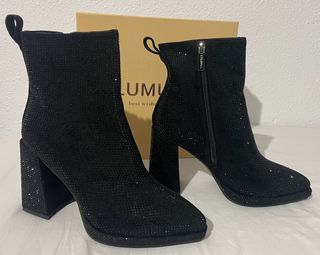 Estos botínes son hermosos, ideales para no pasar desapercibida. Están cubiertos por miles de brillos negros que le dan un toque único. El tacón es ancho, lo que los hace mucho más cómodos de llevar. Son perfectos para salir de fiesta. Cremallera lateral para poner y quitar fácilmente. Te los llevas con su caja original. Talla 39. Aprovecha que este modelo no se encuentra fácil. Mira más cosas lindas en mi perfil y arma tu pack con gran descuento! Precio: 22 € 👉 ⚠️ Precio ya excelente y muy rebajado de su precio real. ⚠️ No respondo a ofertas absurdas. Estado: A ESTRENAR, EN SU CAJA.