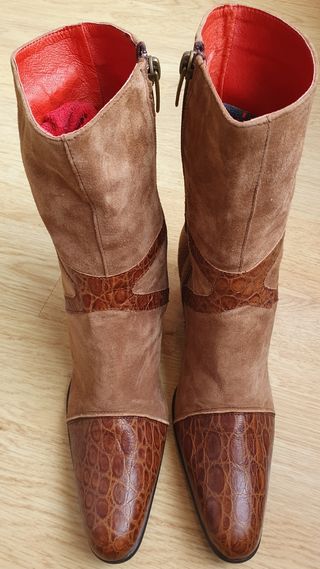 Botines de tacón de piel vuelta combinados con piel grabada en punta y adornos. Talla38. Forrados de piel en su interior. Muy buen estado, apenas uso. Medidas del tacón: alto 6cm, ancho 3cm Altura del botín en pierna 9cm.