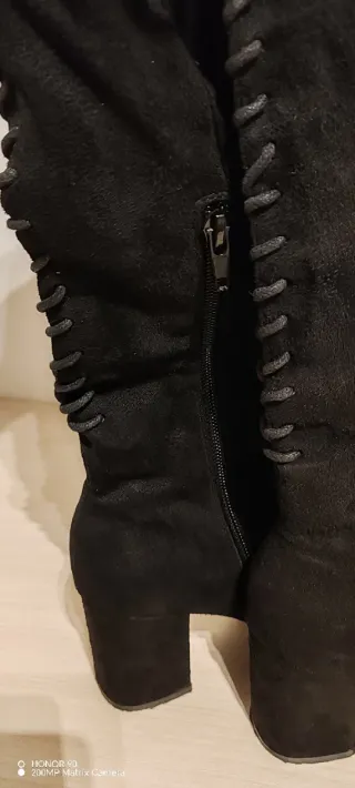 Botines negros de tacón alto, ideales para cualquier ocasión. Son de ante y tienen un diseño elegante y sofisticado. - Material: Ante. - Tacón alto. - Cierre con cordones.