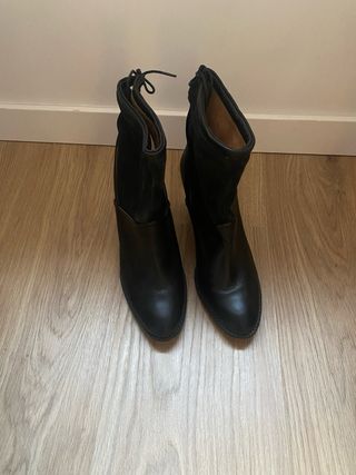 Botines de tacón de la marca N.W.3. Hobbs. - Material exterior de piel y ante. - Diseño con cordones en la parte trasera. - Tacón grueso y cuadrado de 9 cmtrs. - plantilla de cuerp con gel en la parte de los dedos para mayor comodidad. - Suela de goma que agarra perfectamente. Como se pueden ver están impecables. La suela en perfecto estado como nuevas. Puestas en una sola ocasión porque me quedan grandes.