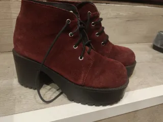 Botines de estilo moderno con cordones. - Material de ante. - Plataforma gruesa. - Tacón cuadrado. Talla 36 ,color burdeos, Muy buen estado, plataforma 7 cm