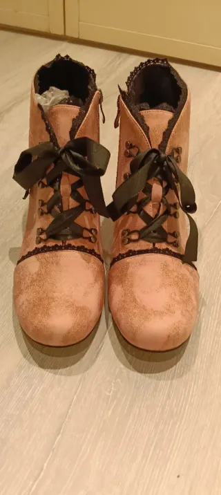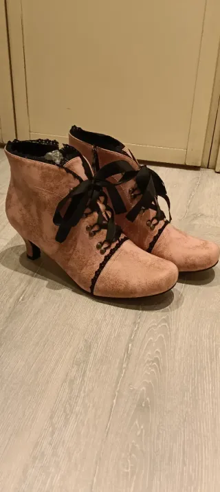 Botines de estilo vintage con un bonito detalle de encaje. - Color rosa empolvado. - Cierre de cordones negros. - Tacón fino. - Adorno de encaje negro en el borde.